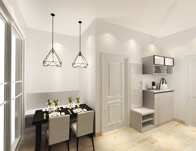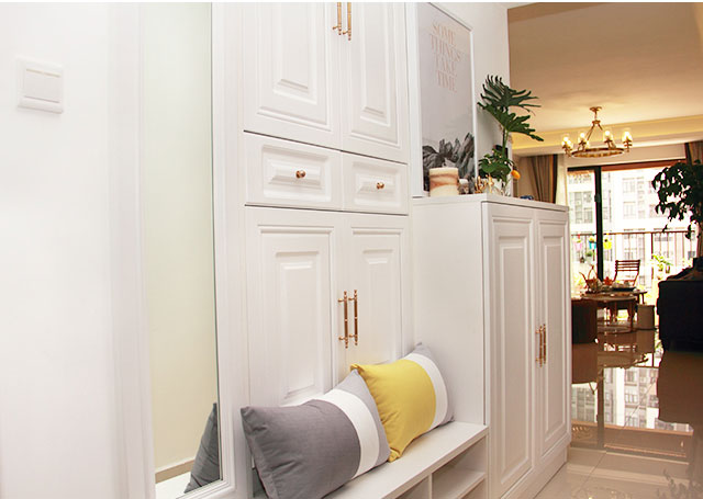 内嵌设计的鞋柜,可以与墙体合二为一,即便走廊过道较窄,置顶设计也不会显的逼囧。