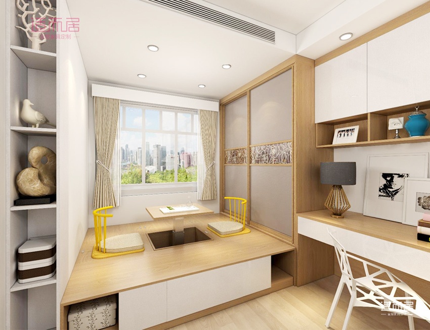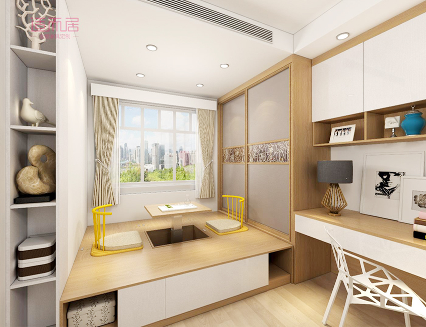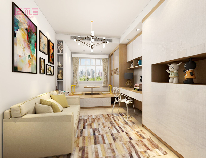 榻榻米与书柜、书桌连体搭配,合理利用空间,榻榻米抽拉式储物箱,增加了收纳空间,最大限度增加了空间的利用率,赋于书房更多的功能需求,全屋简约风格的设计使居室优雅而时尚,配上柜白色欧式柜门,让居室更加舒适轻松,以无胜有的留白艺术具有很高的审美价值,让人体会到小空间也有大设计的美感。