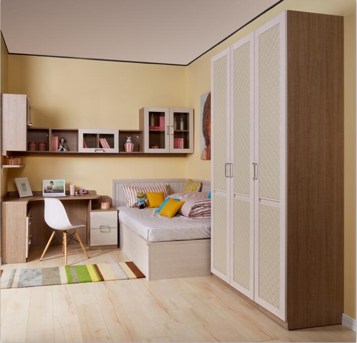 该款儿童房主要分为左右两侧:左边是床、书桌,右边则是书柜、储物柜、衣柜组合,这样的设计让中间空间变得特别大,完美体现了“小户型大格局”的特点,让整个小空间变大了!
