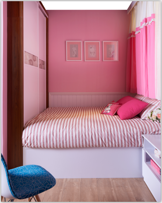该款儿童房设计,将儿童衣柜设计成入墙式,床边设计有书柜、书桌,不浪费任何一处空间。房间中的粉红色设计风格适合用于小女孩房间的装修。