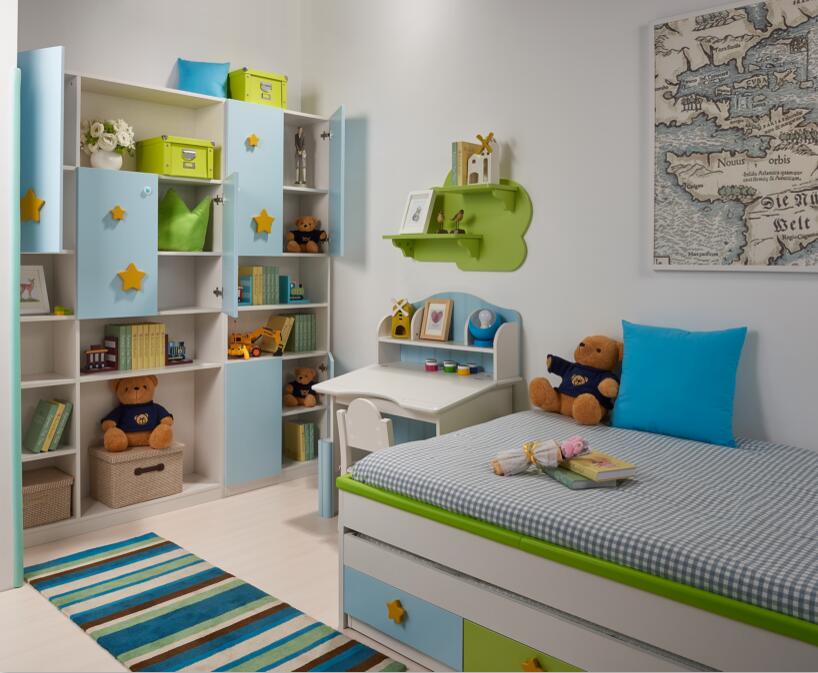 该款儿童房设计,适合只有一个小孩的家庭使用。房间设计充分利用了墙面,吊柜的使用让儿童房腾出了更多的空间,让整个房间更加宽阔,住得更加舒服。