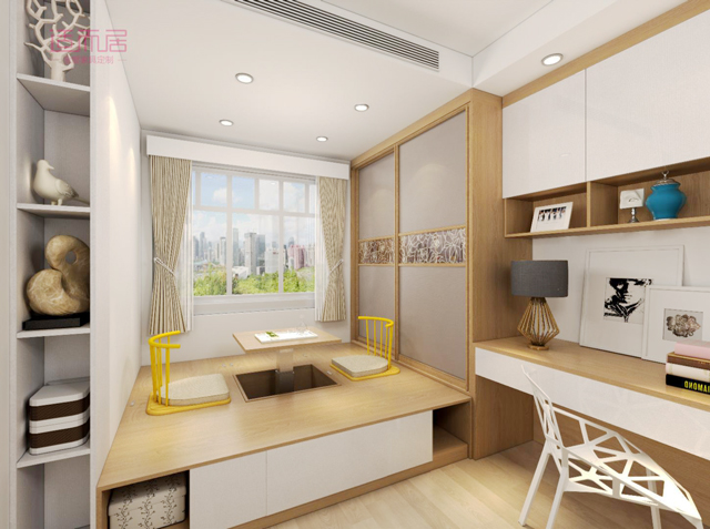 儿童房只有6㎡,除了休息区+衣柜,就还得有学习区;衣柜定制填补缺口,提升利用率。学习桌转角利用,还充当床头柜。