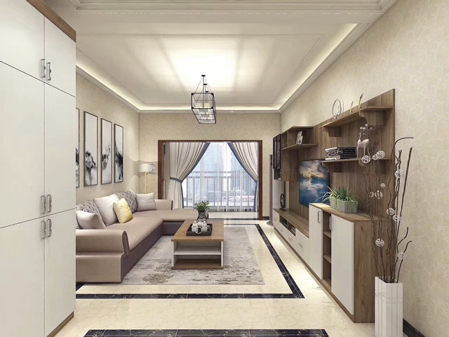 这一户型空间,面积中等,可电视柜的选择,却是向上延伸的展示型电视柜,很好的丰富了视觉层次,半高柜身也不显压抑。