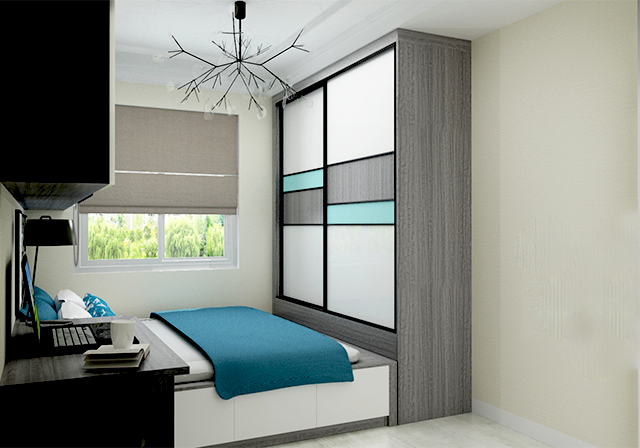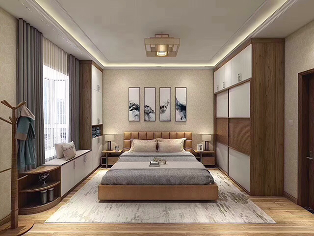 目之所及是一个置顶大衣柜,还有一个带飘窗卡座的储物柜,于床体左右两侧矗立,简单舒适又极具收纳价值。