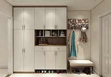 独立出来的玄关则添置了一置顶的玄关柜,简约大气强收纳。一个柜身,一张凳子和一挂衣钩,就完美兼备了一家人的生活需求。