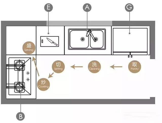 也就是冰箱、水槽、备餐区、灶台的位置,最好按习惯顺手的顺序来安排规划