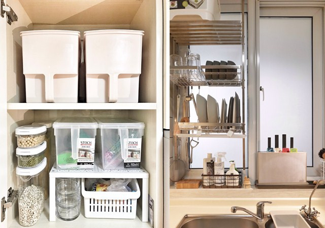 基于空间大小的考虑,会有人选择不增设顶柜,避免闷沉。这种情况需要考虑如何将收纳最大化。借助工具细分空间实现高效收纳