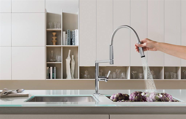 水槽做成台下盆,清理台面更加方便,水龙头选用抽拉式,清理更加简便快速。台面最好加上挡水条,预防水会顺流而下。