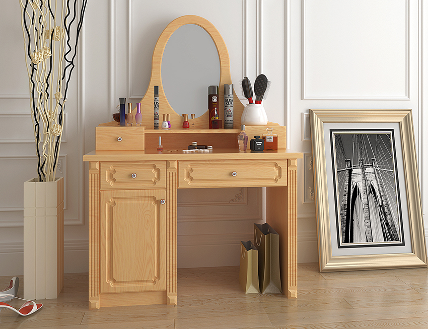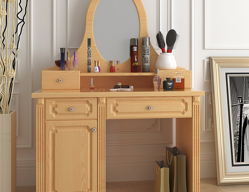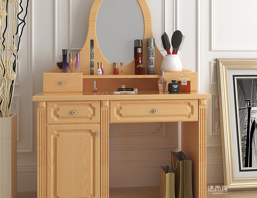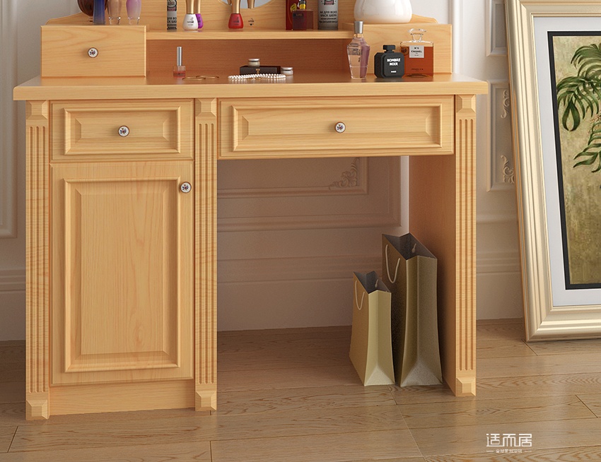 实木梳妆台定制 米白时尚带镜抽屉