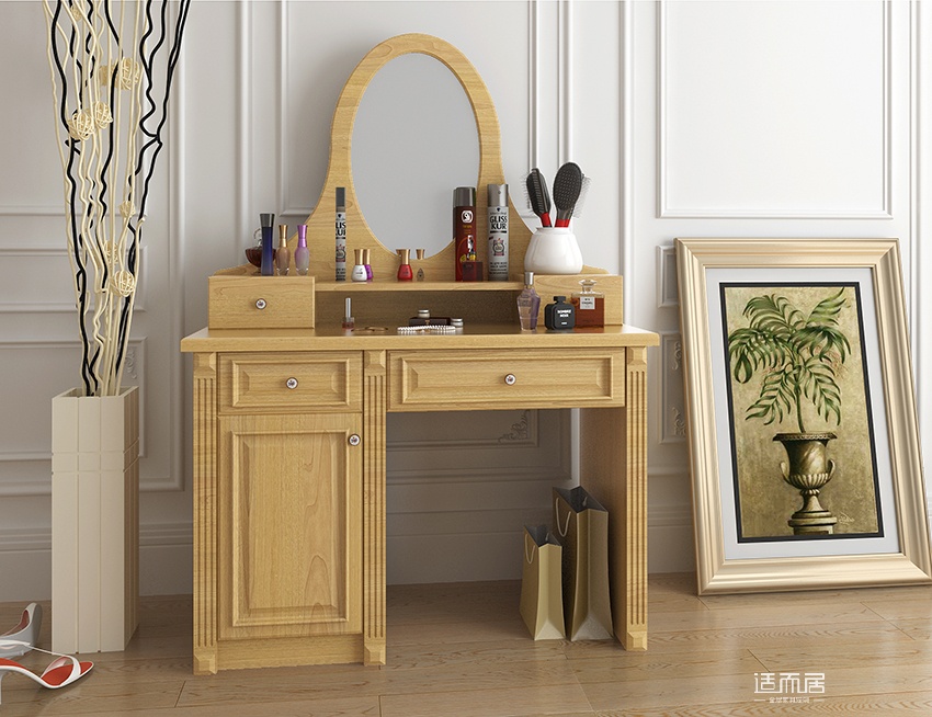 卧室搭配梳妆台设计,可以实现衣妆容一步到位。梳妆台造型简单时尚,手感细腻,精湛的吸塑工艺,细化收纳空间,形成丰富的展示区,摆放一些艺术品在旁装饰,空间也多了一点美感。