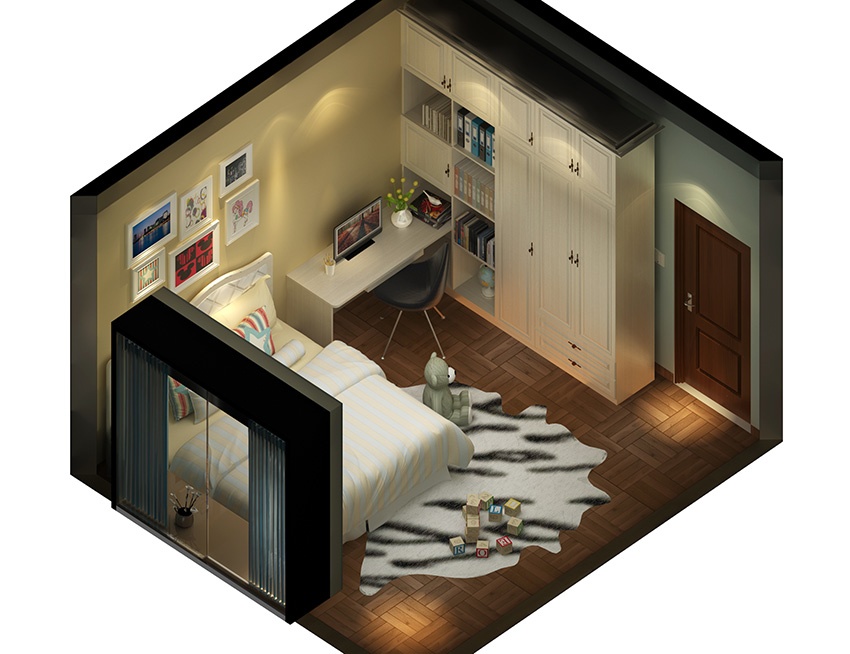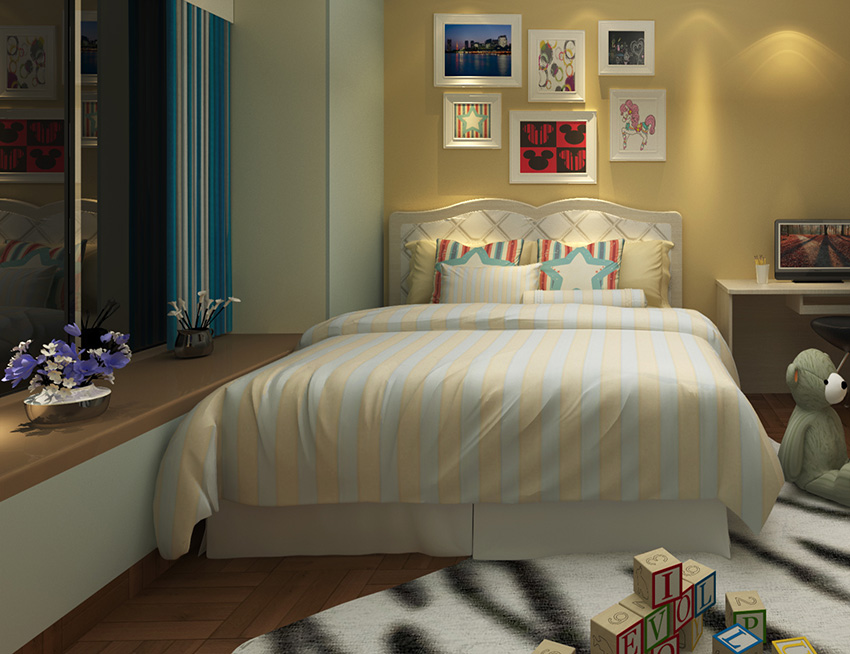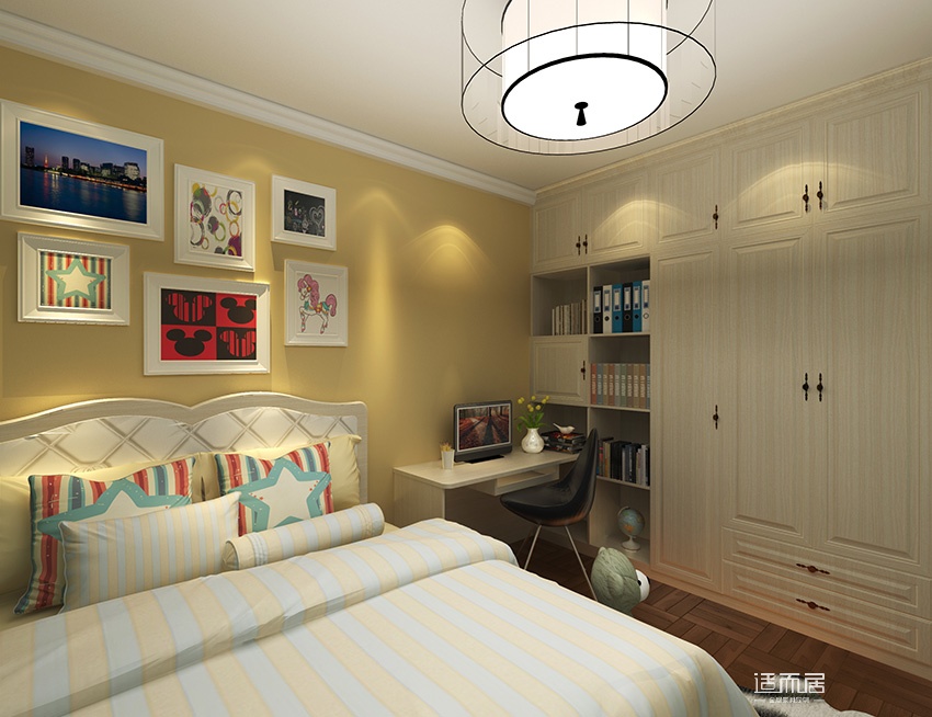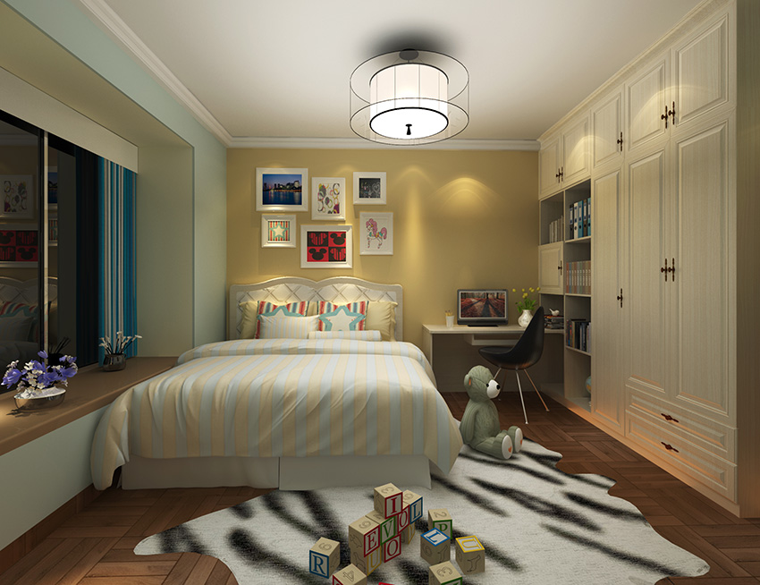 清新淡雅的色调搭配,柔软舒适的小孩子床,十分适合性格较为安静的孩子。有独立的学习玩乐空间,还有定制的一体化书柜拼接衣柜组合,孩子的童话书、玩具、衣物都可以一一的存放在房间里。