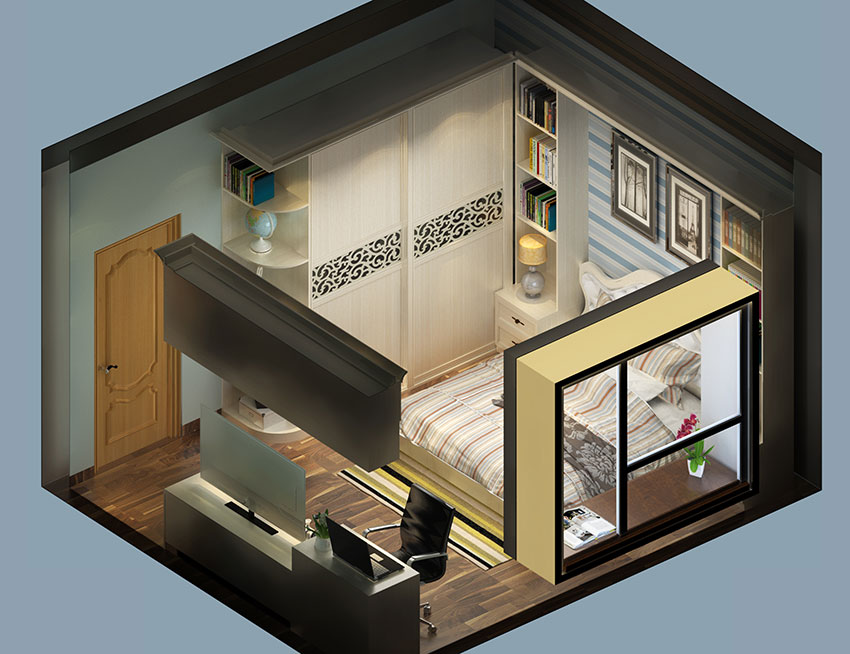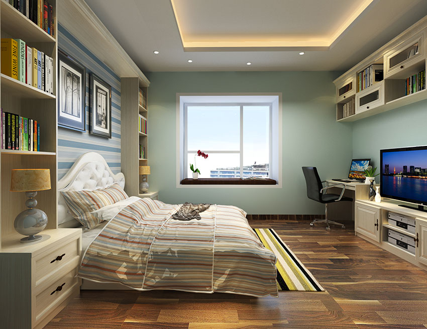 整体性强,有效利用墙面空间,储物性强。床边两侧进行书柜打造,形成简单的小学习区,毫厘空间都得到利用。衣柜款式简约,照应床头背景墙装饰,细腻中见时尚和情调。