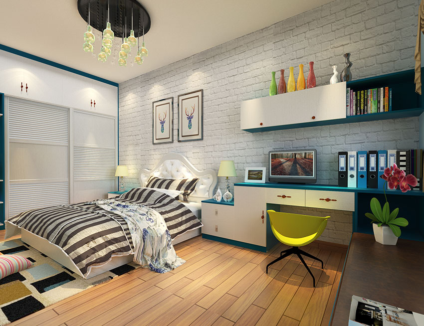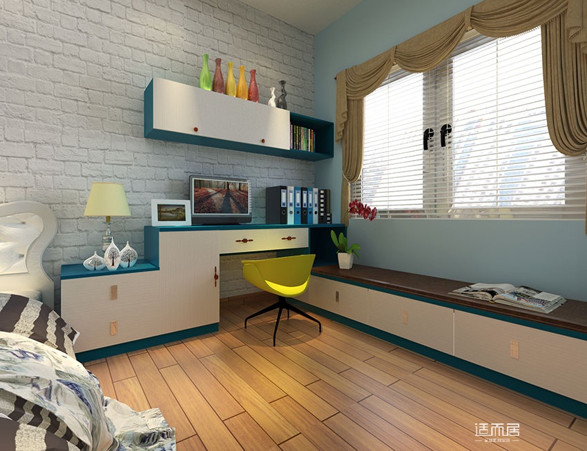 整体空间采用简欧风格进行设计,床的两旁设计了床头柜,侧边墙面设计置顶衣柜收纳,窗边位置设计了书桌组合,蓝白的色调增添时尚感,整体空间具有独立的功能区域,是人性化的设计。