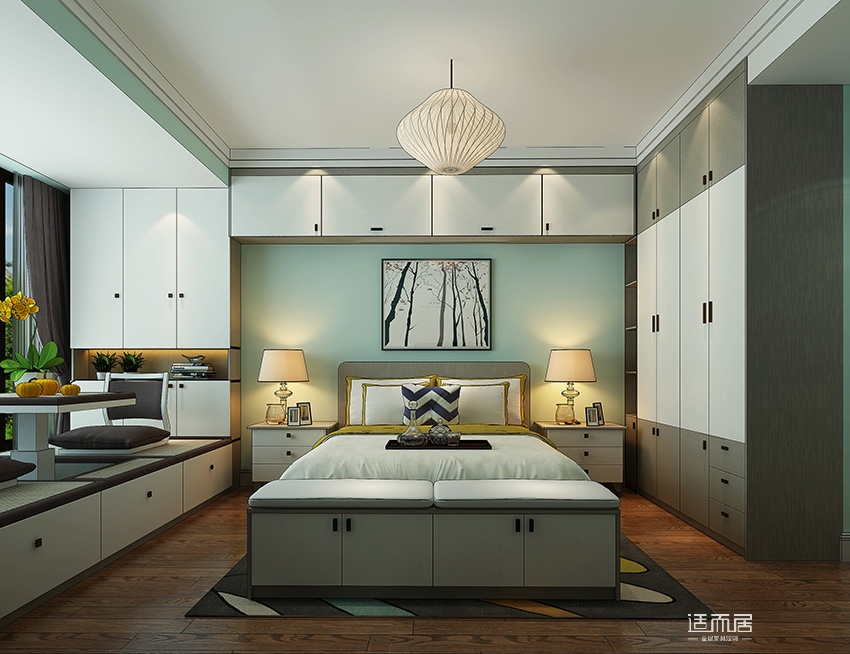 卧室选择摆放精而简的家具,给人干净利落的感觉。榻榻米的设计打造,空间装饰时尚新颖。床尾一体式家具摆放设计,有效利用了上层下层空间,增强了卧室的整体储物空间。
