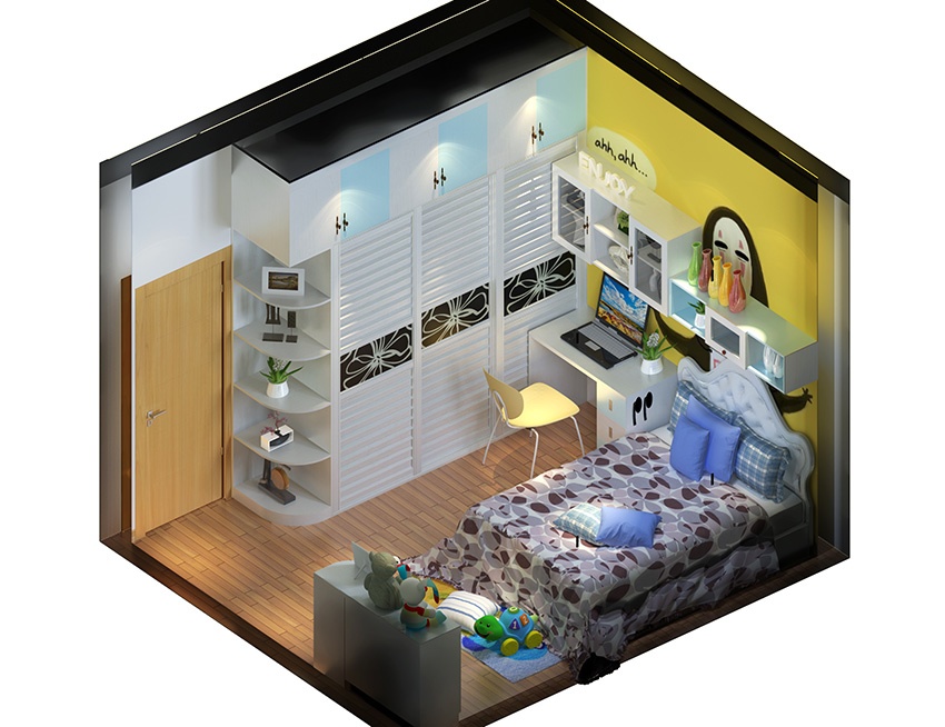 小户型的儿童房也可容纳不同家具,到顶衣柜+书桌+床并列排放,是家居定制性的完美诠释,床头上方紧靠着墙壁的吊柜设计,空间利用极致化,也突显实用性和多功能化。