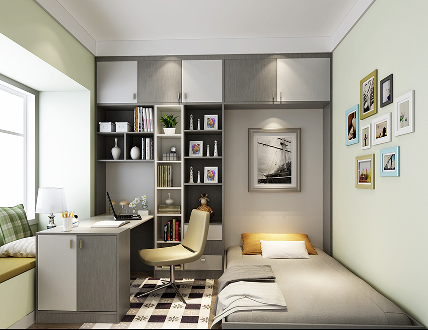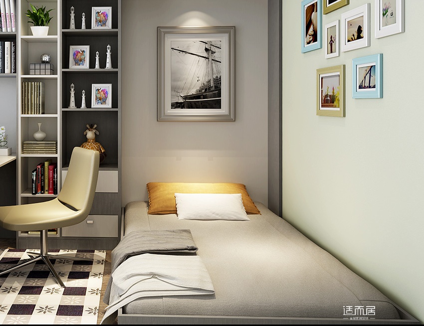 卧室不在于大,而在于精,连卧床也可以灵活的储藏或展开,空间视觉效果尤为宽敞。家居造型造型简单,色调轻浅,简约时尚,用用饰品点缀,使整体感觉更加美观温馨。