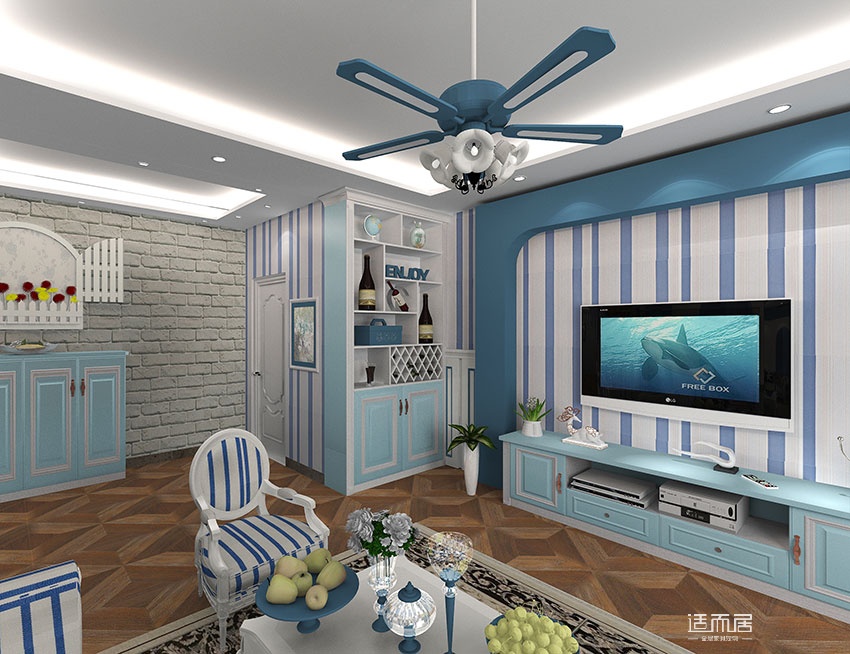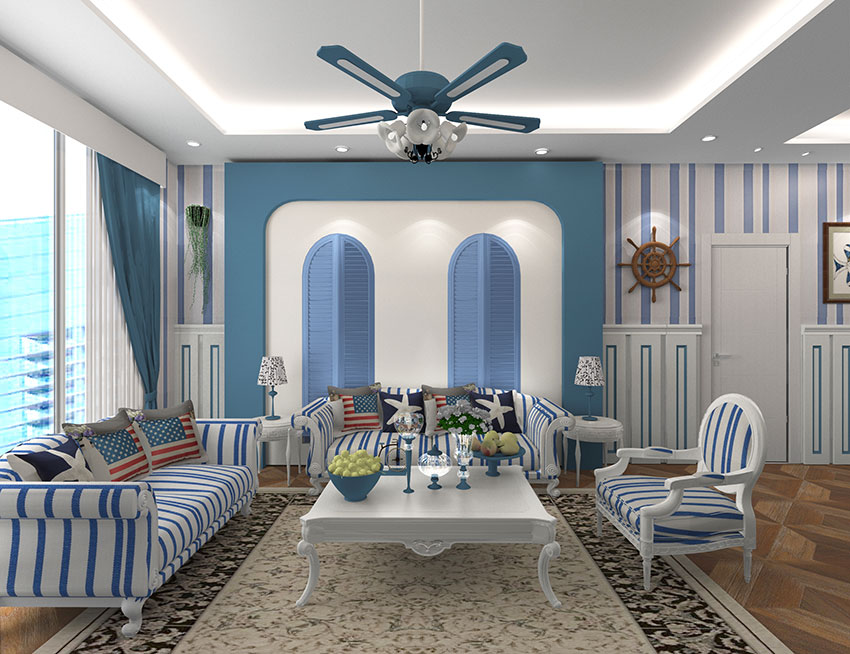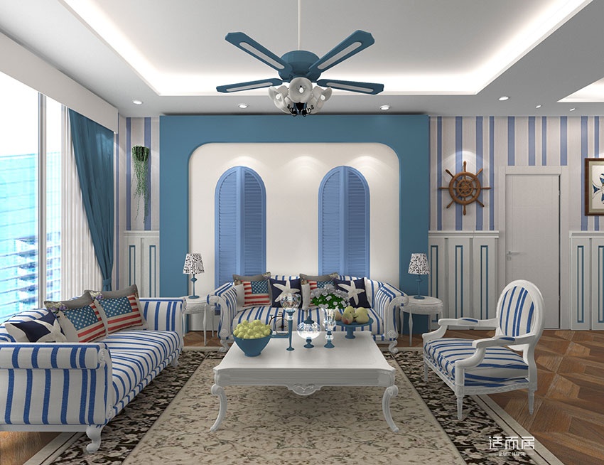 地中海风格客厅,给人清透舒爽的感觉。整体色调以蓝色为主,宁静蓝与墙面设计搭配线条相搭配,空间富有干净通透的感觉。家具的摆放对称呼应,是立体感与层次感的呈现。