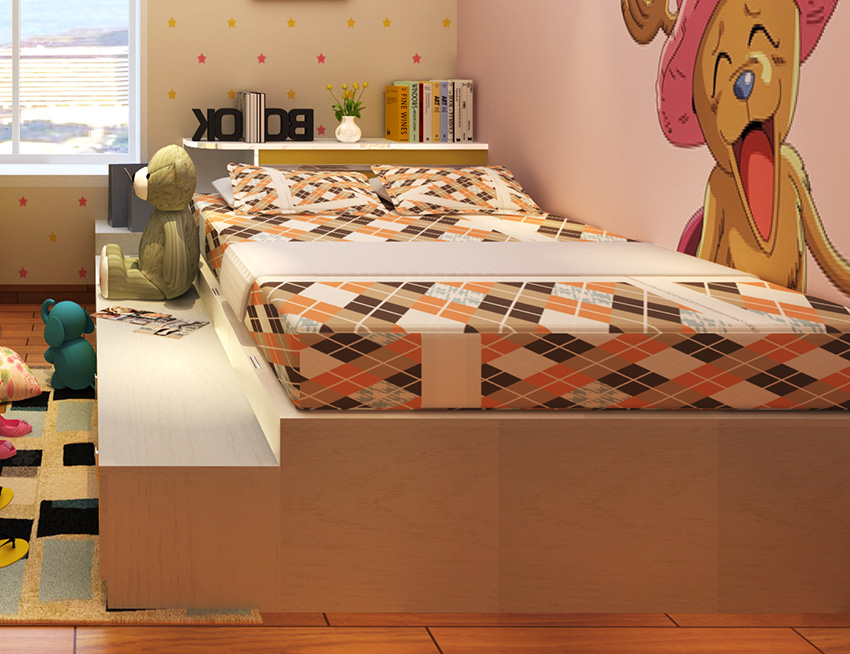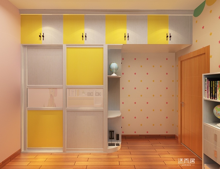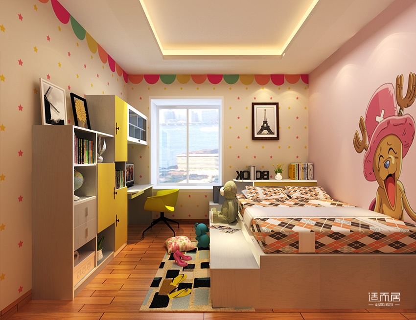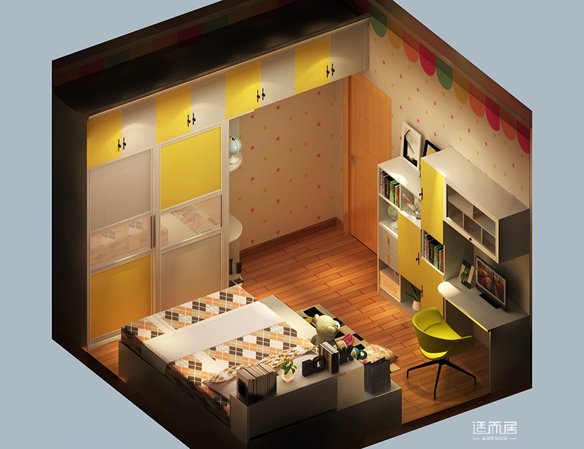 整个空间用了用了暖色基调,温馨舒适。墙纸多彩的设计,可爱童趣,适合孩子居住。书柜用了亮眼黄,房间在视觉上富有色彩冲击力,书桌与书柜一体,不仅可收纳摆设,也方便孩子学习阅读。