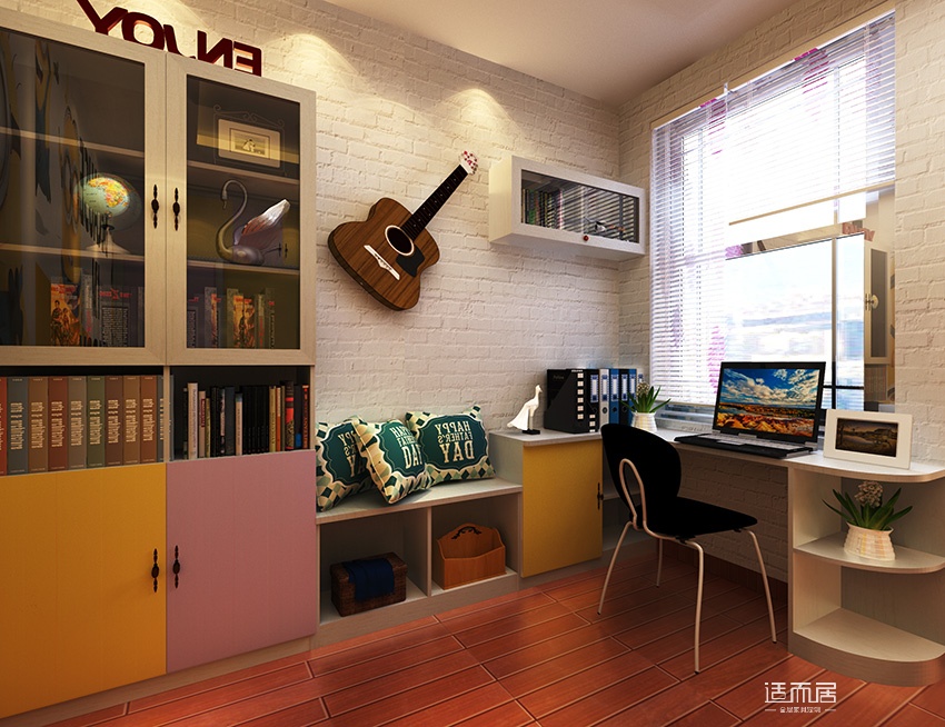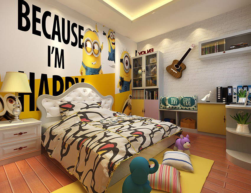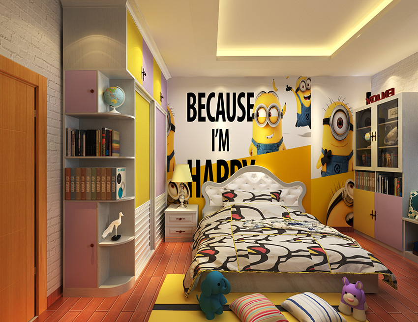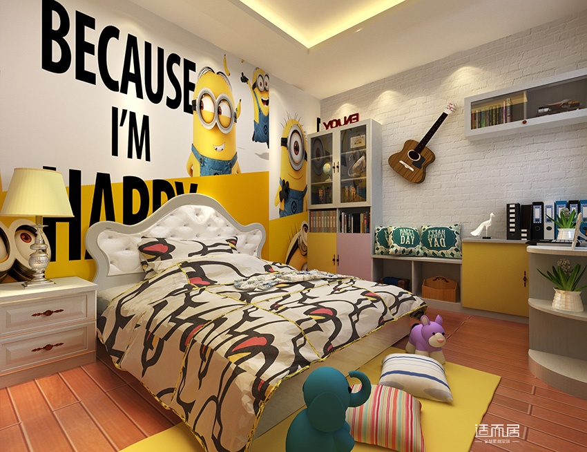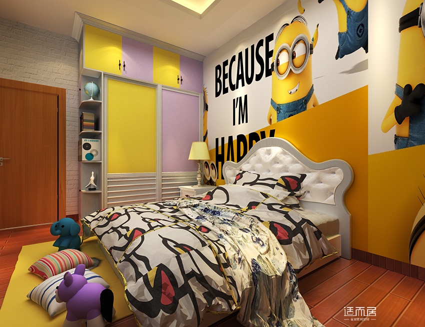 儿童房的设计重点是童真多趣和整洁干净。墙面的卡通设计,可爱童真,空间活力多彩。移门衣柜和书柜的简约设计,使空间富有立体感,可放书放衣物,使用收纳简单方便。
