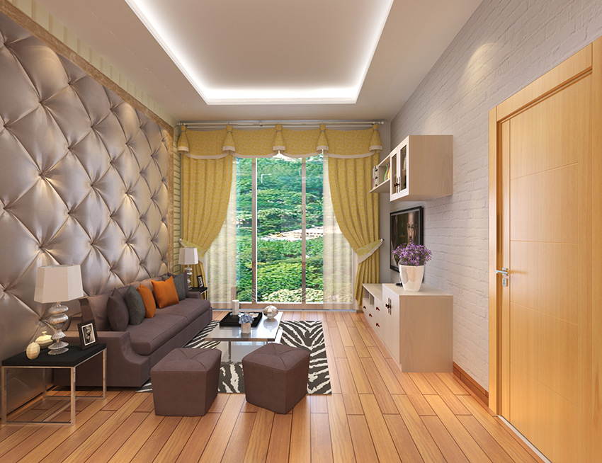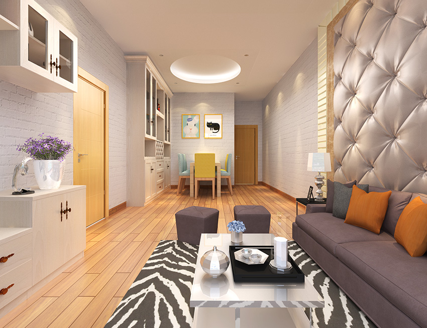 深棕的布艺沙发搭配白色几何茶几餐桌,富有现代时尚气息。柔软的沙发背景墙设计,造型新颖独特,给人舒适美观的视觉感受。专门定制的电视柜、酒柜设计,增添了储物功能,使空间告别杂乱。