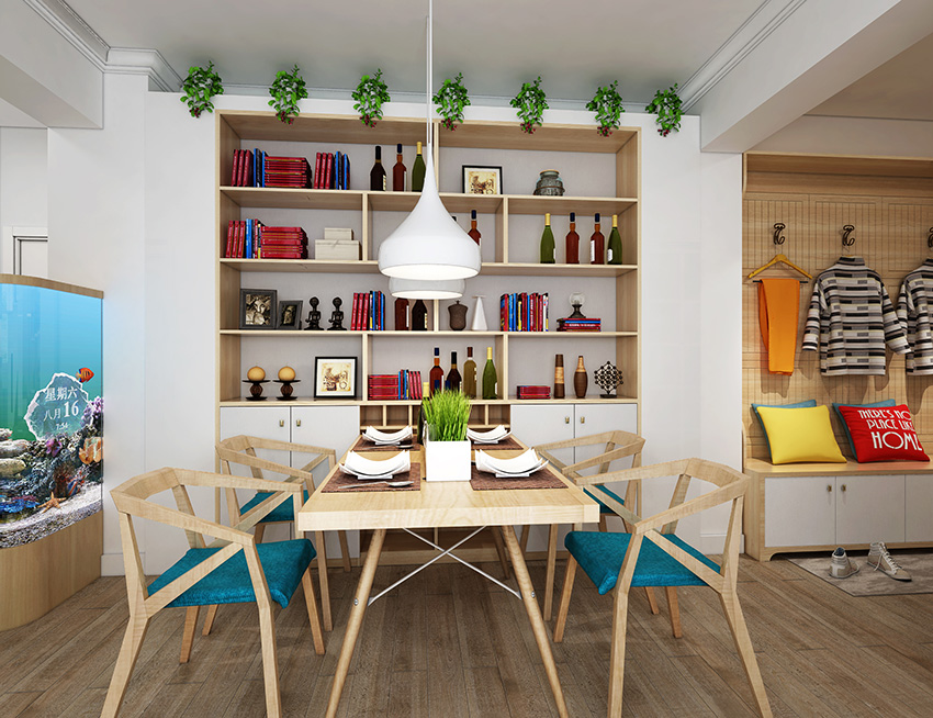 现代简约客餐厅注重简约、时尚,不规则的吊灯,搭配柔软舒适的沙发,空间富有休闲感和现代感,时尚中不失活泼。延伸的餐厅,既是家人聚餐的地方,也是个人休闲阅读的好去处。
