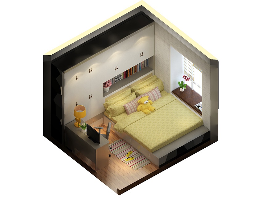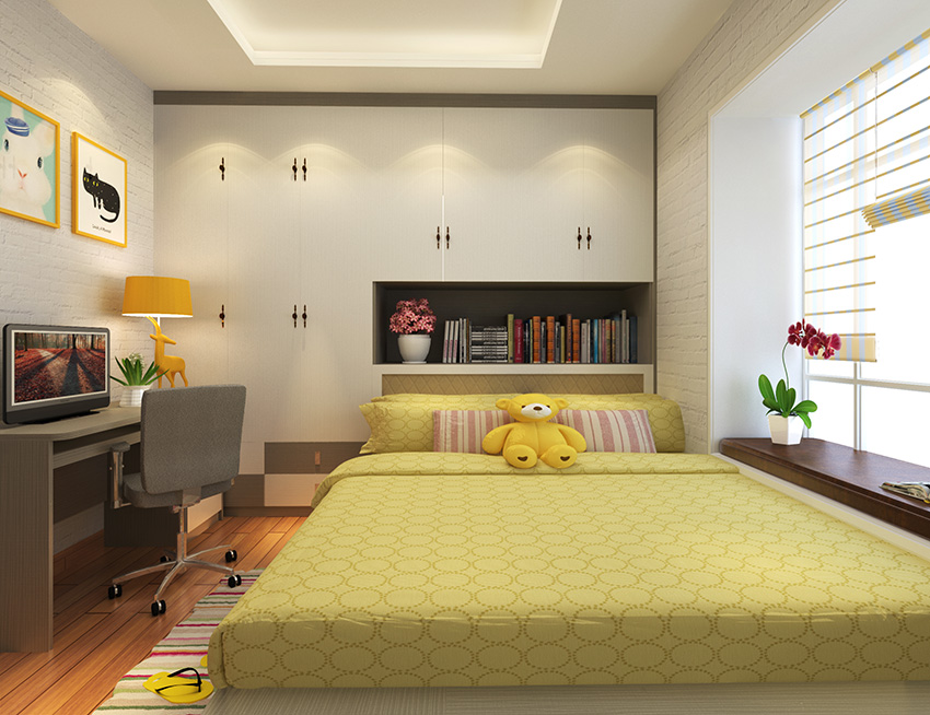 衣柜到顶设计,将空间上下利用到极致,增强了衣物的储物功能,方便实用。床单采用活力的色彩,使空间更加富有活力感。
