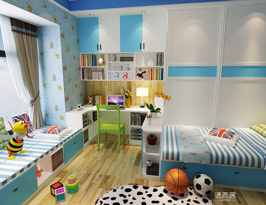以蓝白两色为主色调,像海洋一样充满浪漫和冒险的感觉。睡床用榻榻米代替,上休息下收纳,美观实用。用书桌和飘窗柜、衣柜和飘窗柜两组柜子对空间内的房柱形成包围效果,柜柱合一,毫无突兀感,空间利用率也得到提高