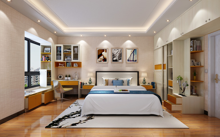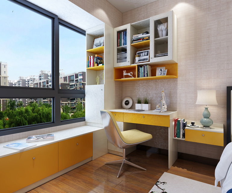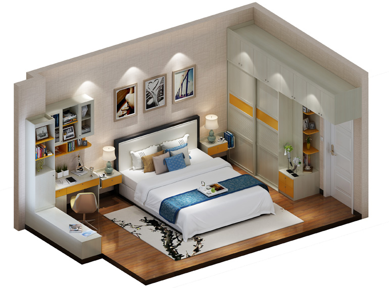 卧室的功能区布局合理,可满足睡眠、学习、休闲、储物多种功能。窗台下是飘窗,飘窗两侧是储物柜和书桌。埃菲尔系列的衣柜一门到顶,增大储物空间,门板45°的线条与波西米亚软床形成呼应,营造欧式浪漫的氛围。