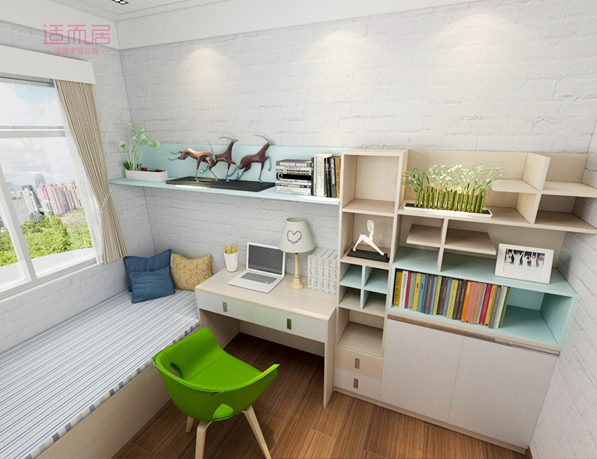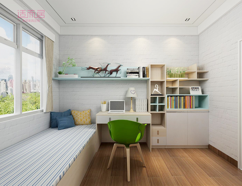 书房很温馨实用,书桌柜可用于办公,累了可在床休息,一房多用,打造最强精神食粮补给站。