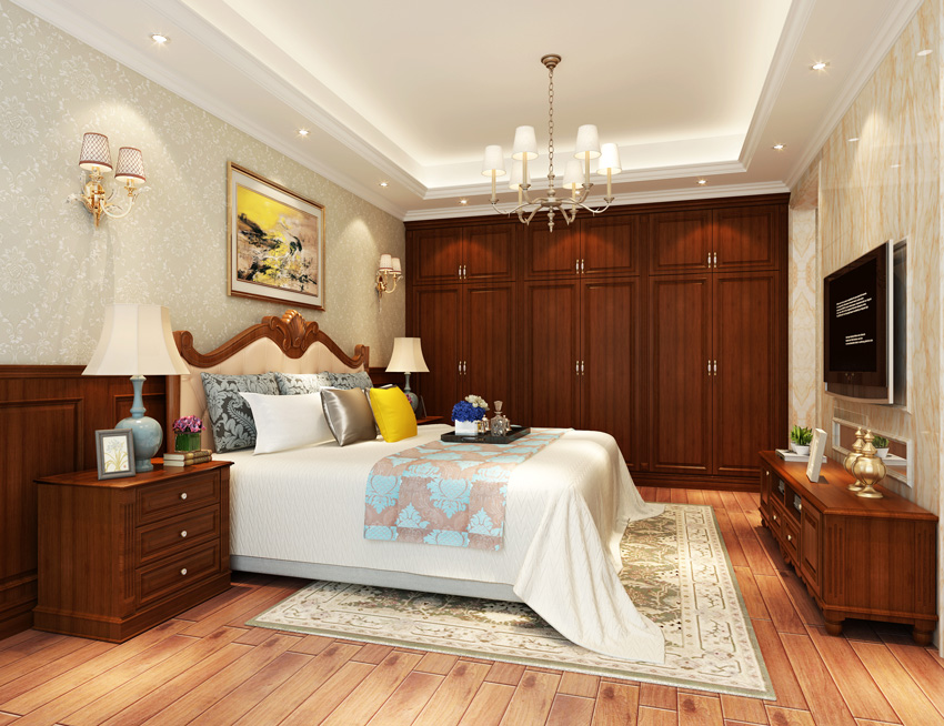 在空间布局上,合理设计了梳妆区、视听区和储物区,柜体的拉手选用陶瓷材质,起点缀作用,增添趣味性和清新感觉。衣柜门板用了高档鳄鱼皮,触感佳,彰显高贵优雅的生活品位。奶白宽边简欧布艺床按人体工程学设计,舒适柔软,富有现代艺术性,提供了极佳的休憩场所。